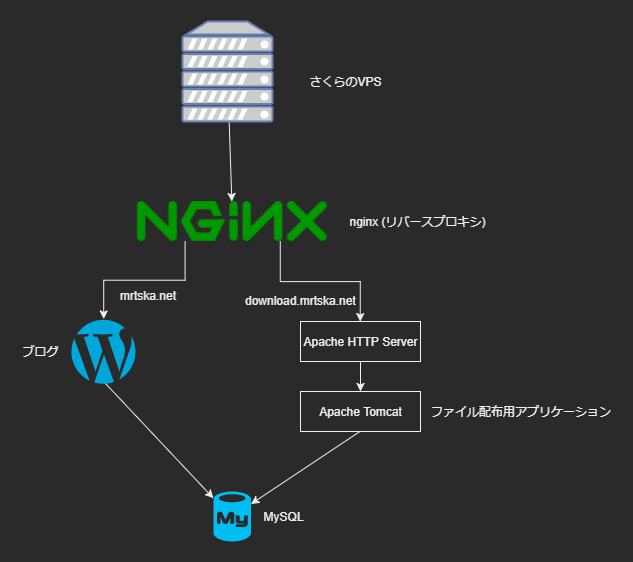 Apache HTTP Serverが挟まっているのはTomcatがnginxから直接データを受け取れないからですね。